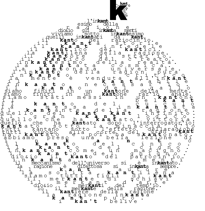inkanti della ragione. la scola kantorum. il tropico kantrico. kanto del giudiz'io. inkanto meta fisico. inkanto empirico. inkanto della verità. inkanto indivi'duale. il kantante prima. il kantante kastrato. kantina della logica. kantilena della ragione.inkanto teoretico. inkanto supremo. inkanto della scienza. inkanto della eternità. inkanto materiale. inkanto formale. inkanto della conoscenza. inkanto dei sensi. il gioco dei quattro kantoni. kanto accorato. viviamo l'uno akkanto all'altro. kant da accompagna menti. inkanto del giogo. kant puro. kant di razza. kant da razio.